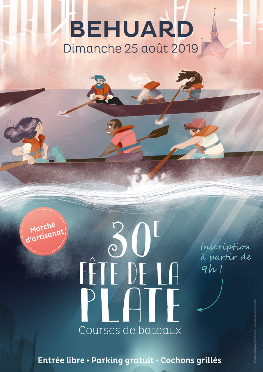 Affiche réalisée pour la fête de la Plate, course annuelle de barques, île de Behuard (49). Réalisation vectorielle.