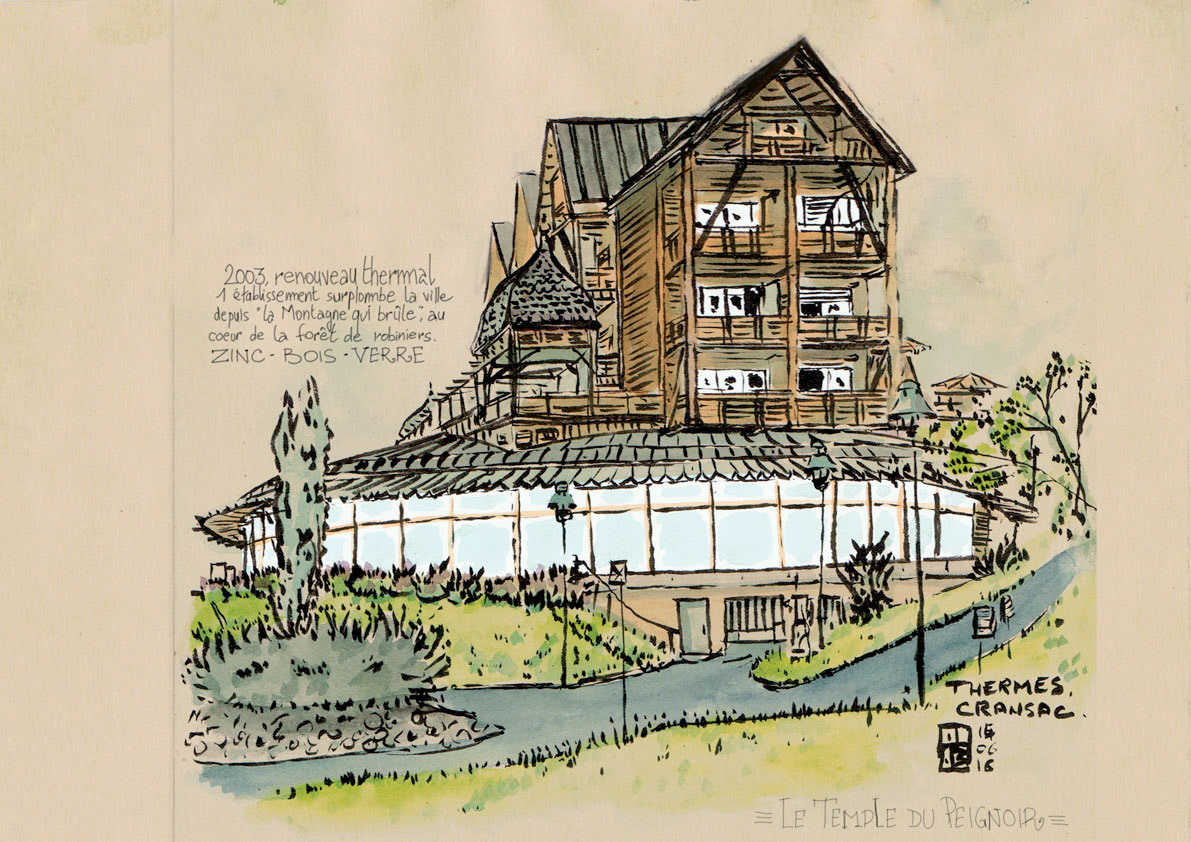 Croquis de la ville de Cransac-les-Thermes réalisés en vue d'une exposition et d'un ouvrage commandés par l'association "La Route des Villes d'Eaux".