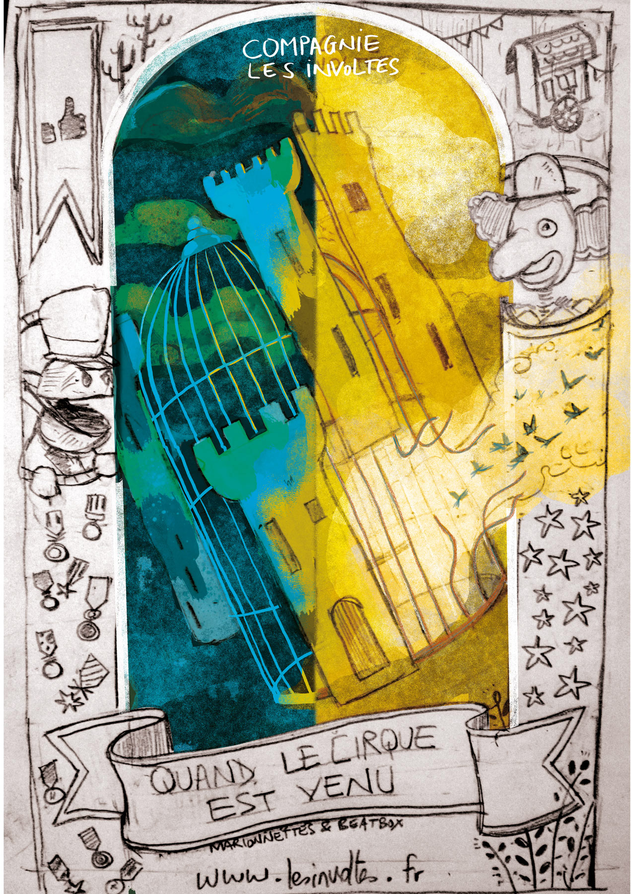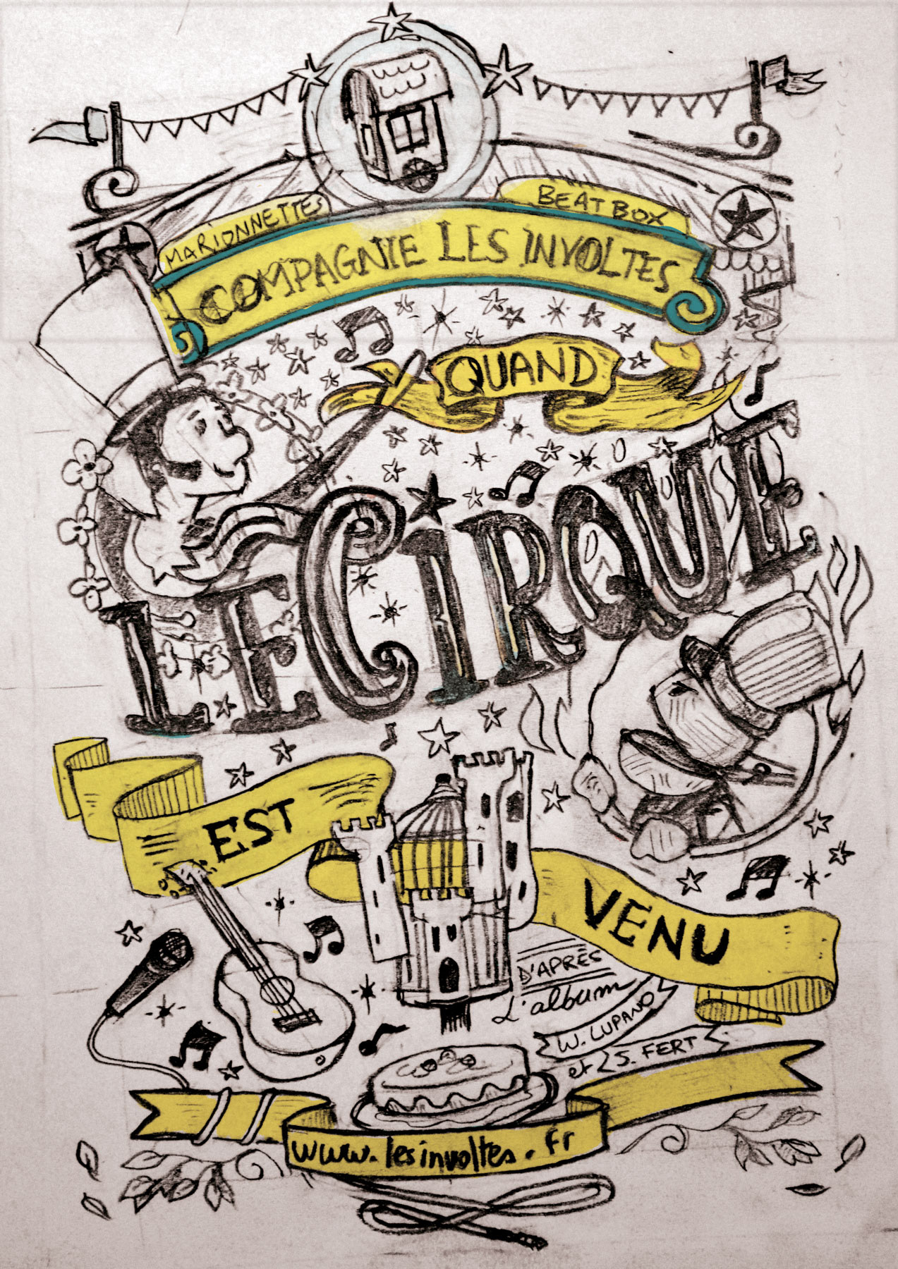 Réalisation d'une affiche illustrée, commandée par la compagnie LesInvoltes. Communication sur un spectacle de marionnette inspiré de l'album jeunesse "Quand le cirque est venu" de W. Lupano & S. Fert.