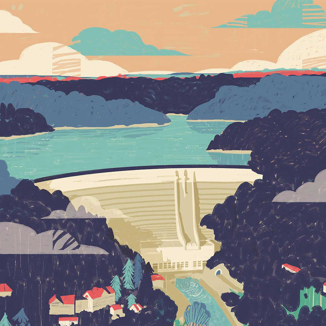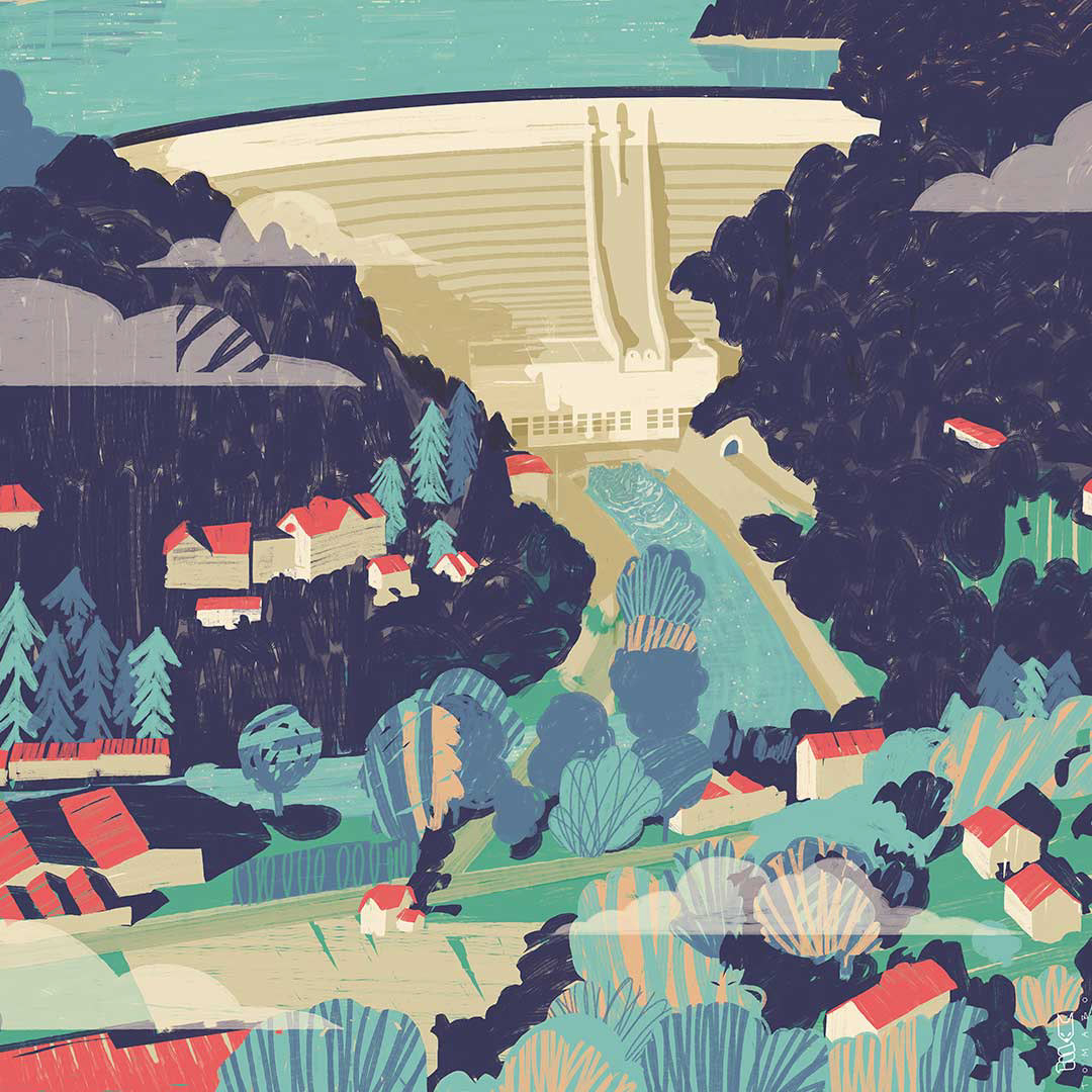 illustration du barrage de Bort-les-Orgues réalisée pour Tourisme Haute-Corrèze. Le visuel fait partie d'une collection d'images qui illustrent plusieurs villes.