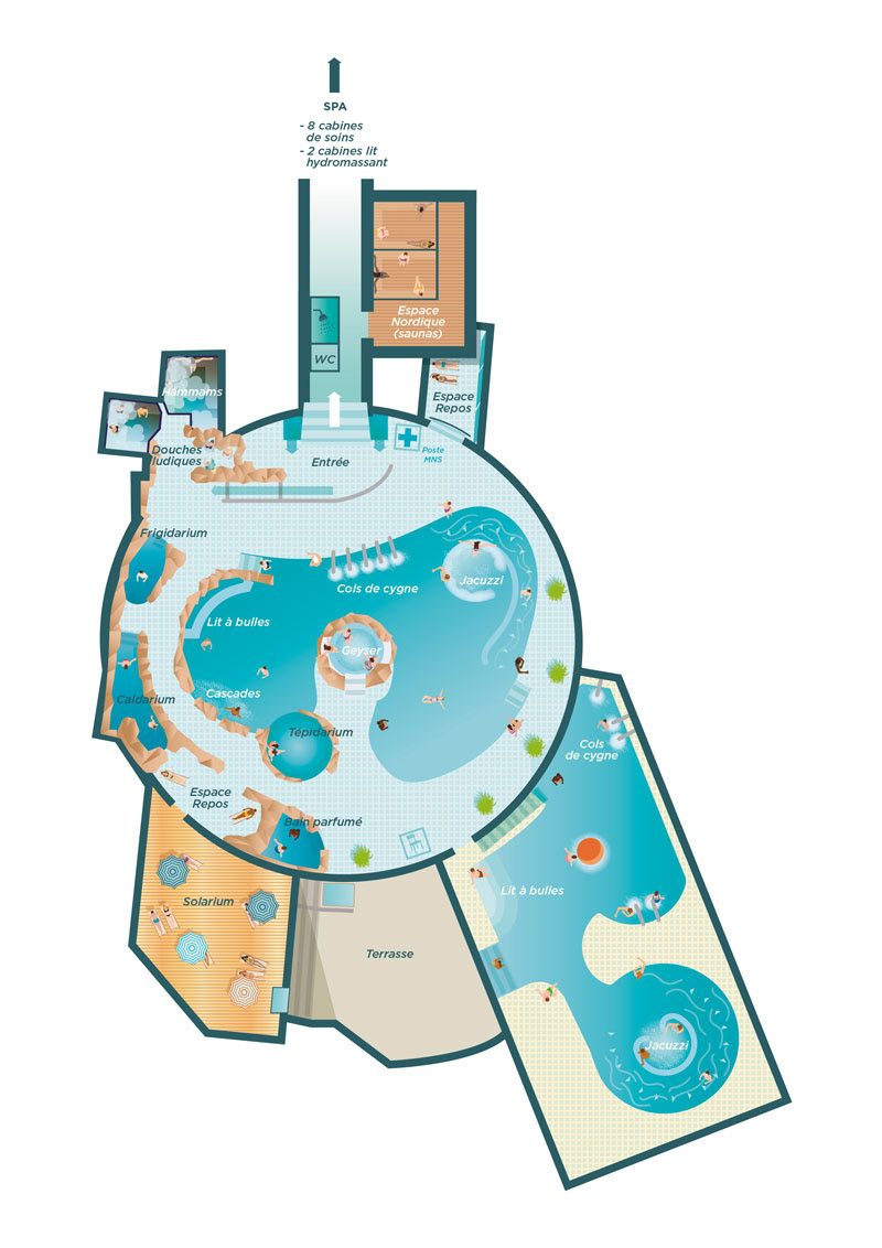 Plan des bassins de la piscine Royatonic à Royat (63). Travail vectoriel.